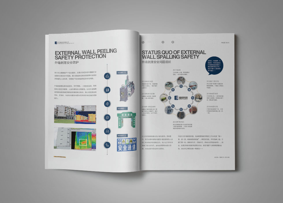 項(xiàng)目背景:武漢墻安科技有限公司是一家專業(yè)的房屋安全治理與維保服務(wù)商,以房屋外墻安全檢測(cè)與風(fēng)險(xiǎn)預(yù)控為核心業(yè)務(wù),提供專業(yè)的外墻空鼓、剝離、脫落檢測(cè),以及風(fēng)險(xiǎn)評(píng)估、風(fēng)險(xiǎn)控制、方案設(shè)計(jì)等服務(wù),為各類住宅、辦公寫(xiě)字樓、工業(yè)廠房等房屋提供全壽命周期內(nèi)的持續(xù)性、全方位安全保障。艾的爾承接其畫(huà)冊(cè)設(shè)計(jì)制作,成立品牌設(shè)計(jì)小組,與企業(yè)進(jìn)行深入溝通,明確企業(yè)對(duì)于畫(huà)冊(cè)設(shè)計(jì)的需求,通過(guò)對(duì)企業(yè)行業(yè)屬性和主要服務(wù)的深入了解和研究,在畫(huà)冊(cè)設(shè)計(jì)、創(chuàng)意的過(guò)程中,封面大膽留白,將重點(diǎn)突出“房屋外墻剝落安全治理專家”。